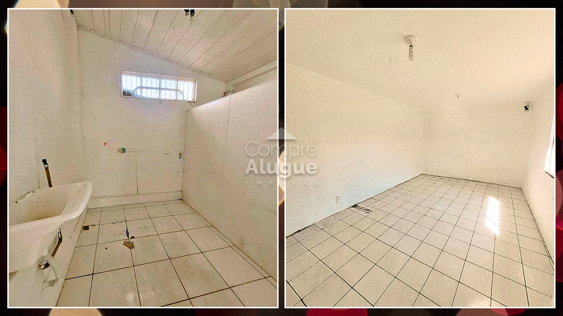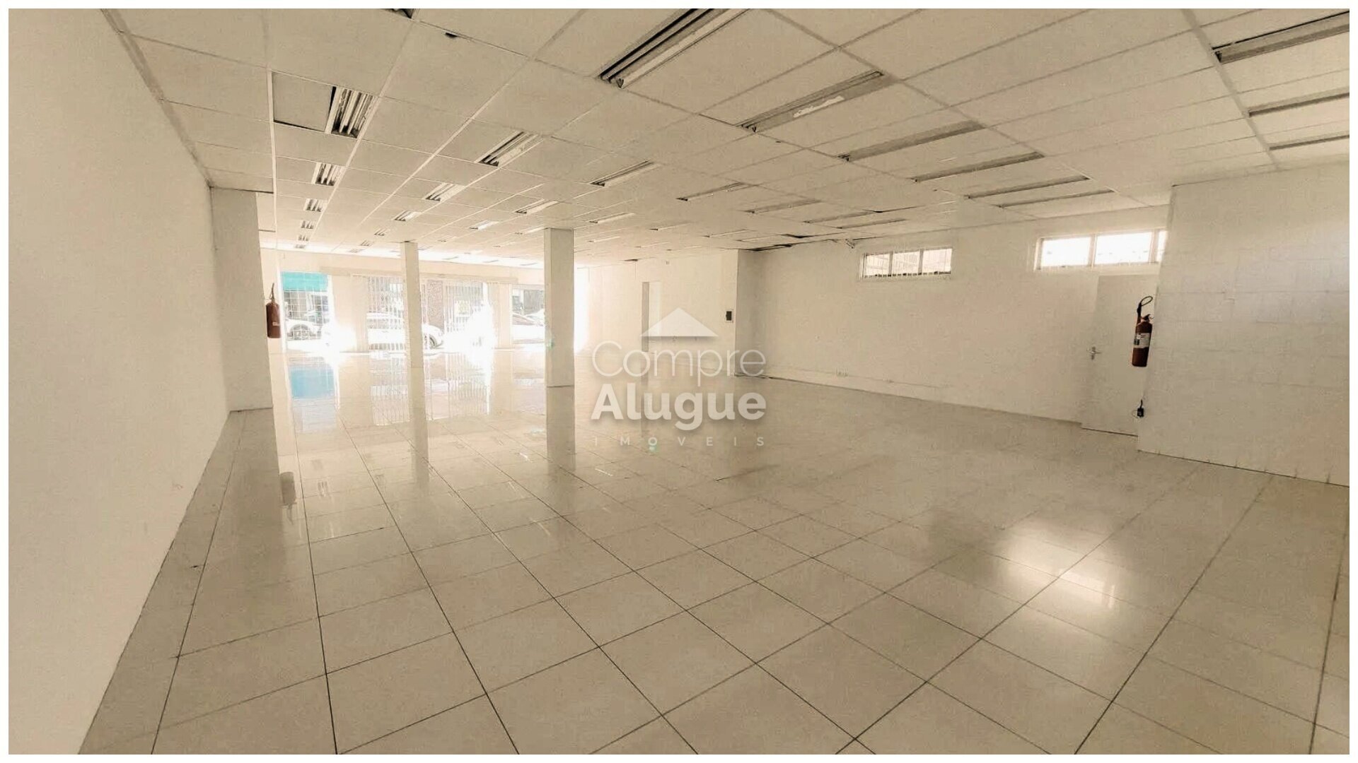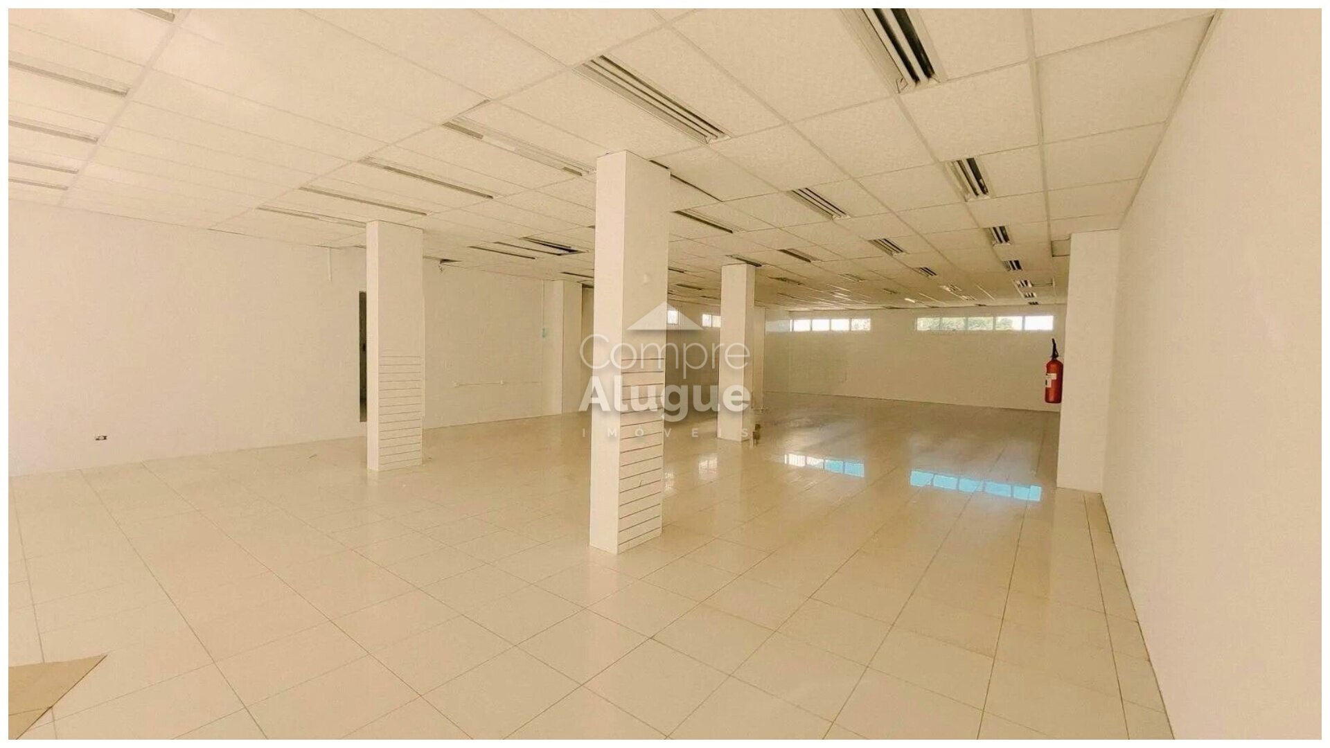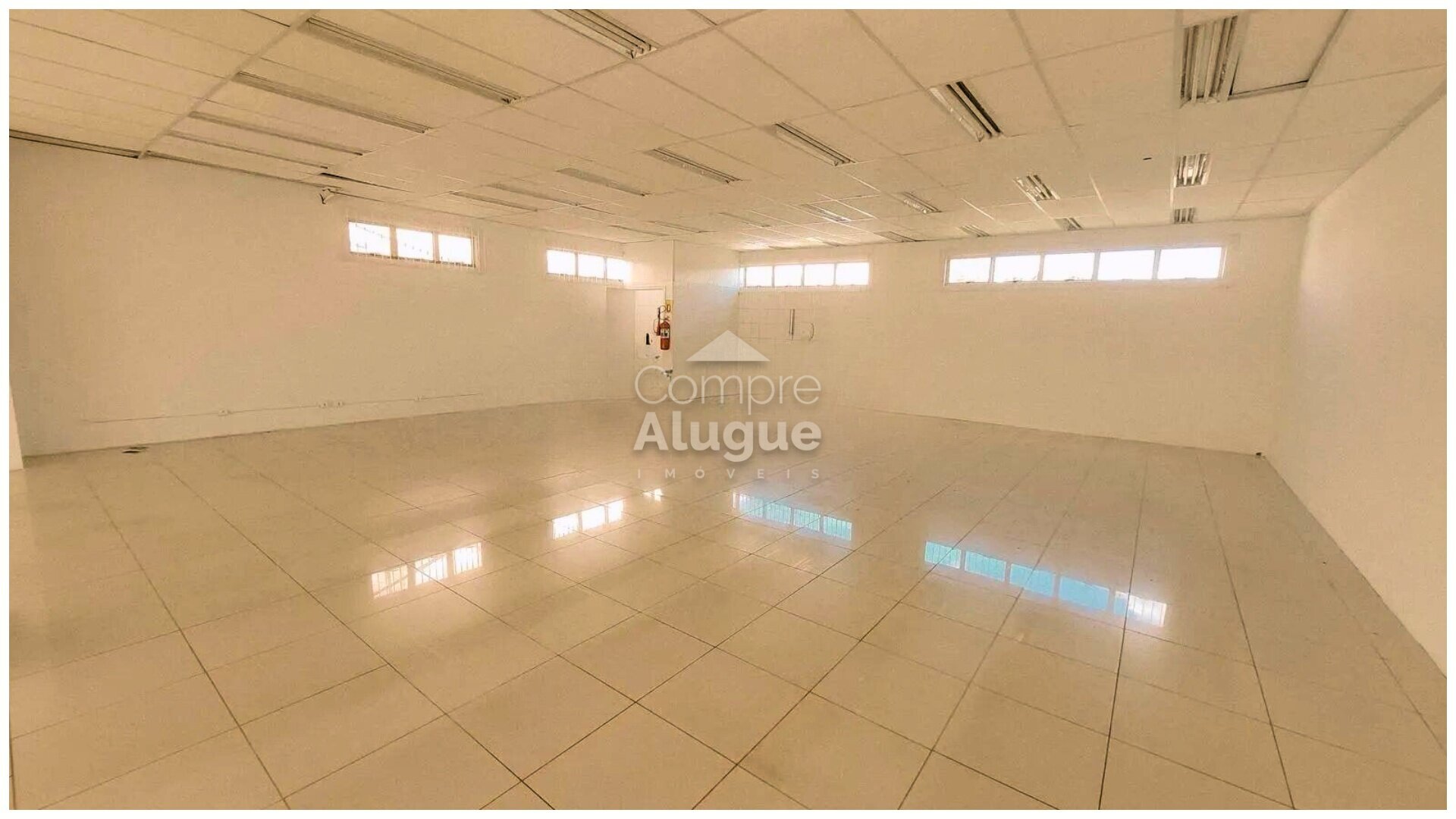 Espaço praticamente livre, entregue com piso cerâmico e luminárias tubulares.